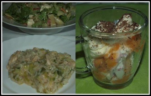 Porovo-piščančja rižota, mešana solata; sladoled s smetano.