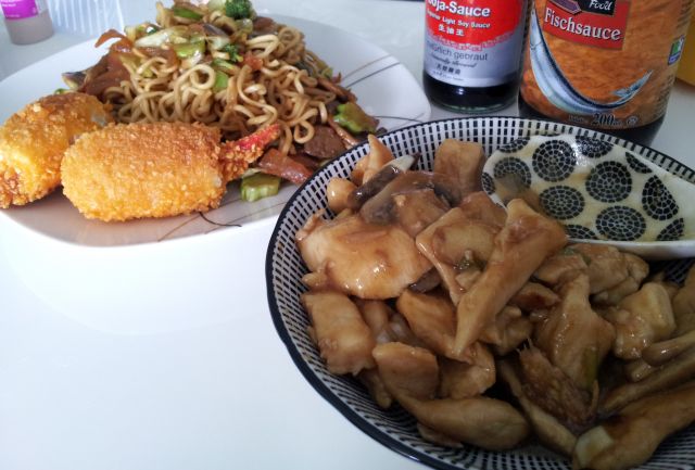Danes: na kitajski način pripravljen domač piščanec s šampinjoni in rezanci po azijsko in še kupljenimi rakovimi kleščami :)