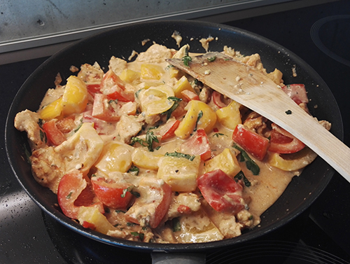 Danes za kosilo/večerjo pa sem naredila nekoliko "chunky" omako s piščancem, papriko, modrim sirom itd. Za zraven sva jedla testenine.