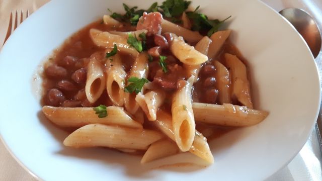 Ni sicer za poletje, ampak pašta fižol s kranjsko meni vedno tekne. Sva z mamo jedli v senci, pa je šlo: