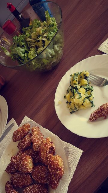 ocvrte piščančje perutke s sezamom in krompir z blitvo..
