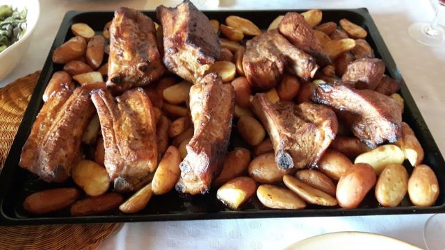Včeraj smo uživali v svinjskih rebrih, mariniranih malce po vzhodnjaško - med, sojina in ostrigina omaka, dimljena mleta paprika, riževo vino, sol, poper, kečap, še neka mešanica začimb za meso. Najprej sem rebra malo pokuhala, jih potem temeljito osušila, premazala z marinado in spekla v pečici, na krompirju. Vmes več krat premazala z marinado. Uh, res je bilo dobro.