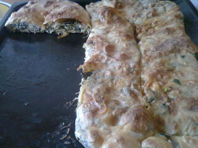 Vlečeno testo pripravim kot za jabolčni študelj (moka, rumenjak, topla voda, ščepec soli, pred počivanjem hlebček naoljim z olivnim oljem).