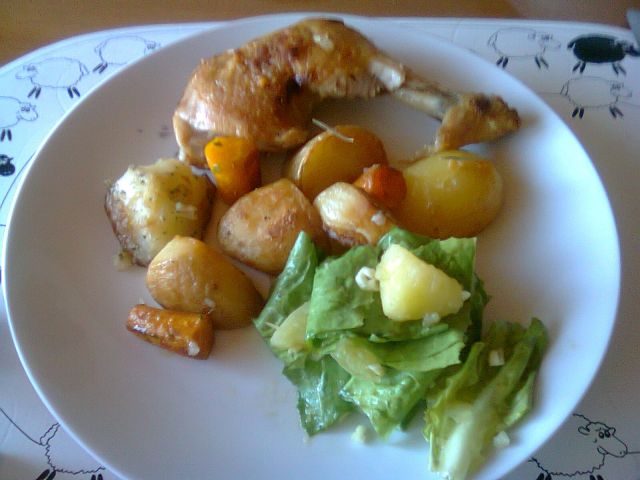 danes pečen piščanec, pečen krompir in mešana zelena solata