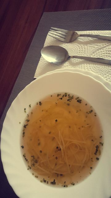 juha, dunajski zrezki (puran), pomfri in zelena solata