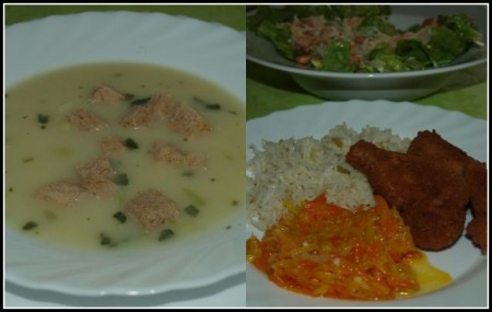 Česnovo-krompirjeva juhica; riž s porom, dušen korenček, panirane piščančje perutničke; endivija z zeljem in fižolom