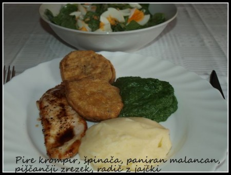 Danes za moja dva panirani zrezki, pražen krompir, paradižnikova solata, zame pa namesto paniranja pečena ribica