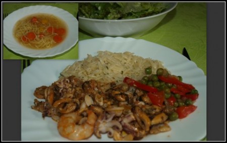 Včeraj smo imeli bučno juho, goveji golaž s skutinimi cmoki, mešano solato iz vrta in domače "ježke". Danes smo imeli piščančjo obaro in jabolčni zavitek, jutri pa bodo testenine po bolonjsko in solata.