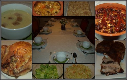 Danes goveja juha z rezanci, stefani pečenka, zame piščančja kračka, pražen krompir, zeljna solata z radičem in zeleno solato, pravljična torta