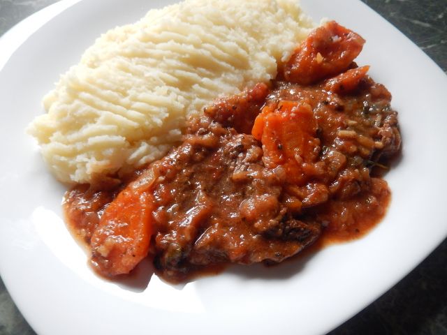 Goveji zrezki v čebulni omaki s korenčki, pire krompir, radič v solati, kupljena sladica ob ![]()
