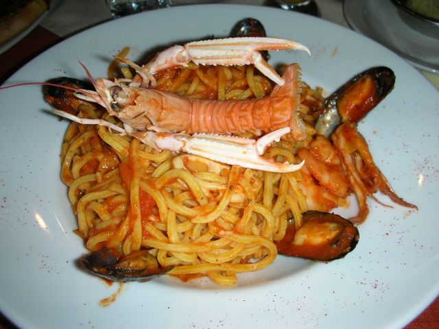 Danes: testenine - školjke v omaki z blitvo, smetano in sirom, pol hrenovka (je bila za porabit) in skleda zelene solate.