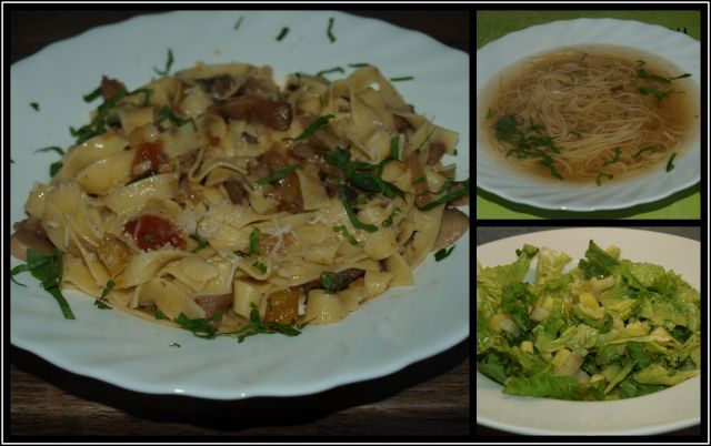 Goveja juhica (od včeraj); reciklaža govedine iz juhe z dodatkom šampinjonov, domači široki rezanci; solata z radičem in krompirjem