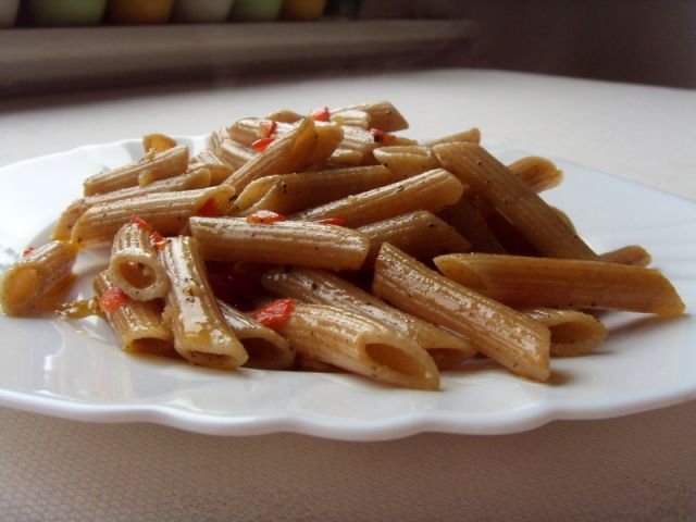 : polnozrnati peresniki v stilu olio aglio e peperoncino