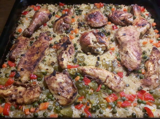 Sicer seem to prvič delala na ta način, običajno riž z zelenjavo in meso vsako posebej v ponvi, takole iz pečice pa sem se že dolgo spravčjala naredit. In bilo je odlično.