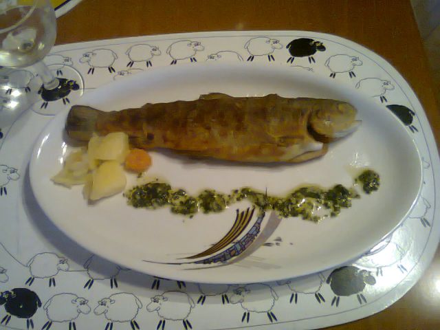 Danes: postrv in priloga (kuhan krompir v kosih, ohrovt korenje). Njami.