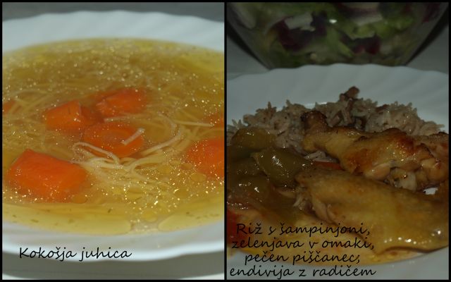 Danes smo dolgo hodili po hribu, gozdu...Doma pa sva s sinom ( prav super je pomagal) skuhala: govejo juho z vlivanci, domač pomfri, naravni zrezki, gobova omaka, paradižnikova solata in zelena solata z motovilcem