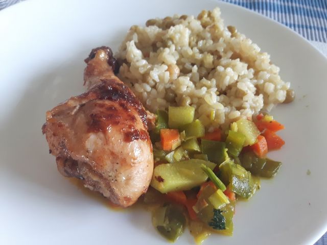 V nedeljo sem porabila ostanke nepohanega mesa in spekla bedra pa perutnice in nekaj mini filejev, ampak na čebuli in začimbah, zraven pa riž z grahom. Aja, pa zelenjavo sem na hitro prepražila, š