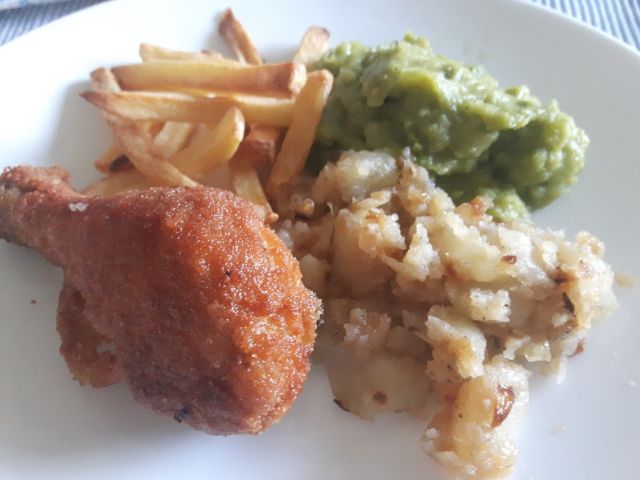 V soboto sem po dolgem času skuhala govejo juho, ribana kaša je bila dodatek. Potem pa pohana kura, pražen krompir, pomfrit in zeleni pire (z graškom seveda), tako da ni bilo preveč enolično na krožniku. Pa kristalka in še rdeč radič v solati, potem pa ob kavi še kupljeni keksi.