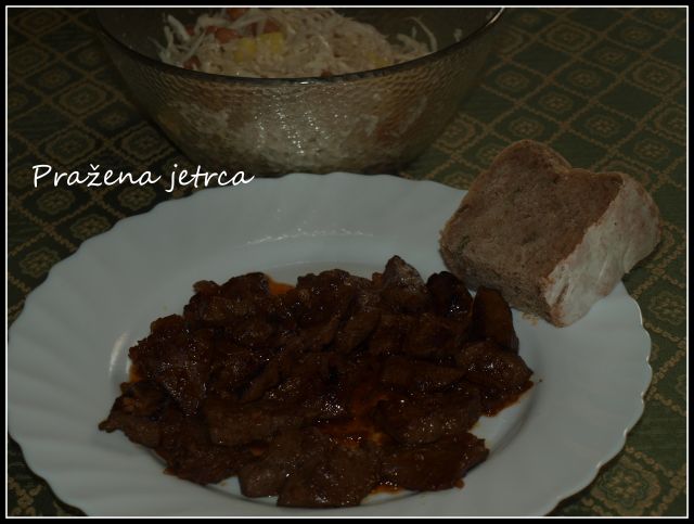 Pražena jetrca, domač kruh, črna redkev, fižol, krompir na solato