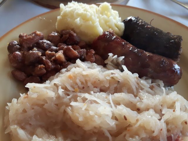 Pri mami: doma kisana repa, domače pečenice in krvavice, fžol na masti, pire krimpir. Čisti užitek.