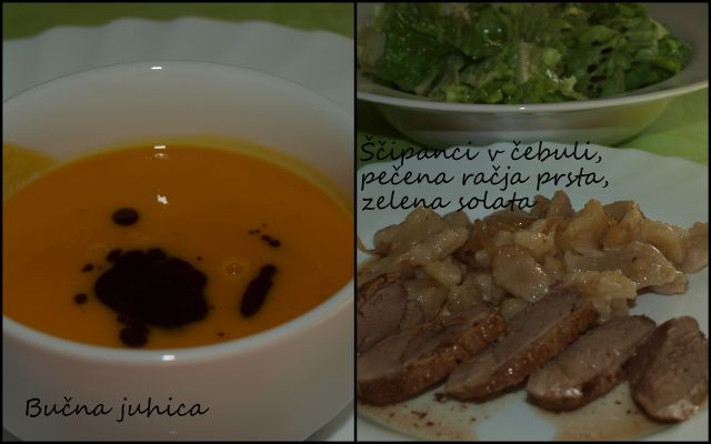 Danes za naju s sinom piščančja juha z vlivanci, za moža pa še malo goveje juhe s fritati, telečji trakci z njoki, zeljna solata z zeleno in radičem.