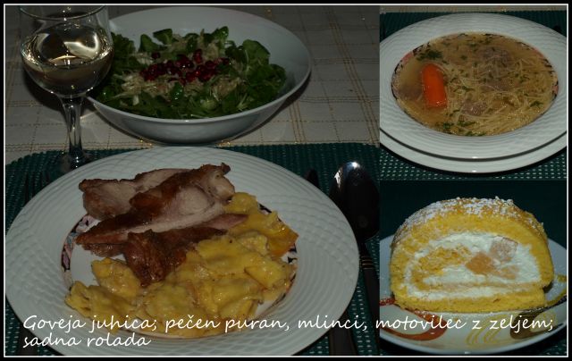 včeraj božična večerja, goveja juha z nudeljci, svinjska pečenka, pečen piščanec, pečen krompir, šampinjoni z gorgonzolo, kuhana zelenjava, solata iz čičerike in fižola, zelena solata, čokoladno pecivo