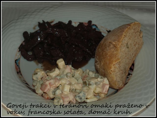 Za silvestersko večerjo sem že pripravila francosko solato, manjka še tunin biftek in narezek. Še prej pa moram speči rulado črni gozdiček za jutri.
