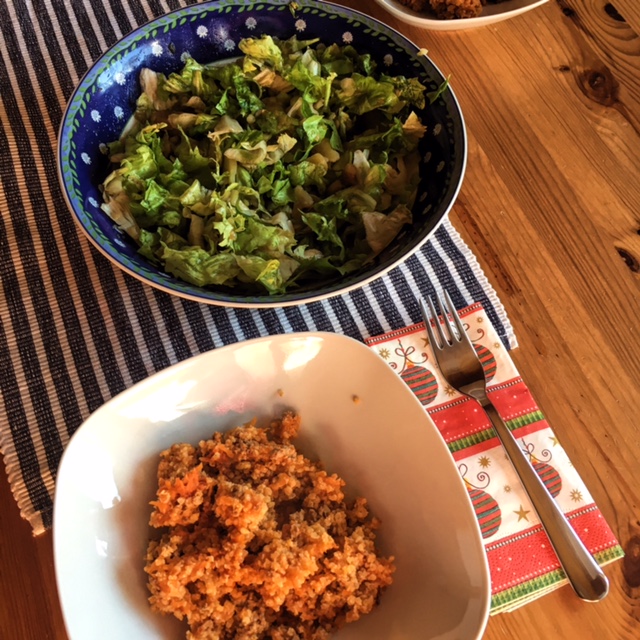 Iz preostanka mletega mesa sem za današnje kosilo pripravila mleto meso s proseno kašo in korenčkom, zraven pa endivijo s krompirjem.