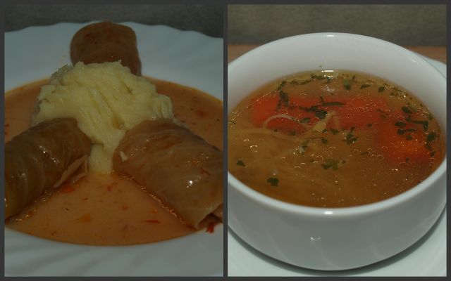 Včerajšnje sarme so zamrznjene, danes goveja juha z zdrobovimi cmoki, pečena orada, pečen krompir, motovilec in zeljna solata z jajčkom.