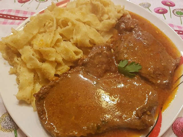 Goveji zrezki v čebulni omaki, široki rezanci na drobtinah, solata....