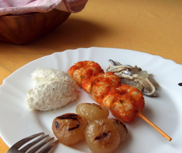 ): bakala na bilo, rakci s papriko, sardoni na šavor, čebulice z žara v olju in vinu, opečen kruh