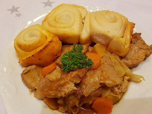 Pri nas, danes *Ruska slana štrudla* s teletino, ki pečena izgleda tako....