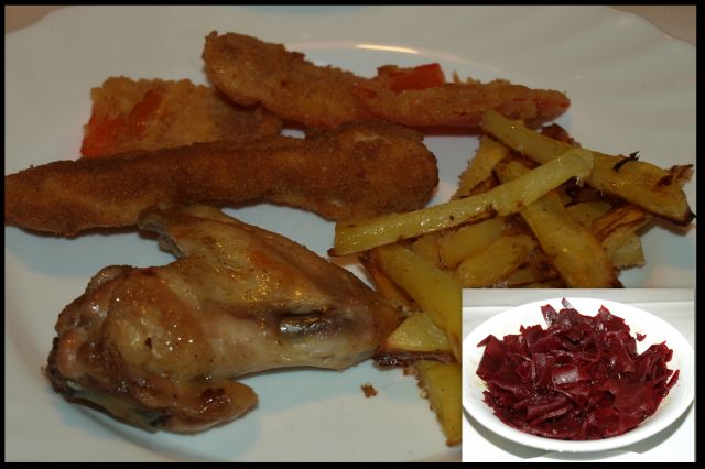 Pečeno piščančje meso, pomfri v pečici, panirani pišč.trakci, rdeča paprika; rdeča pesa: