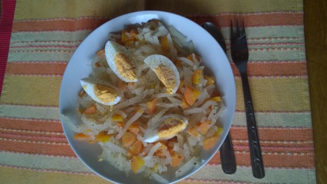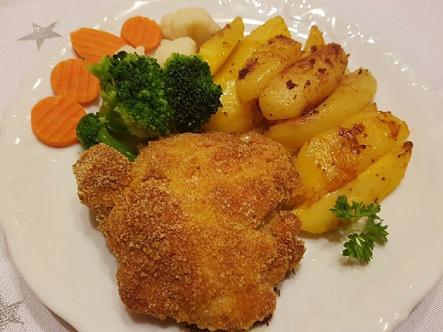 Pri nas marinirano, panirano in v pečici pečeno piščančje meso, krompir s čebulo iz pečice, kuhana zelenjava in solatka ...