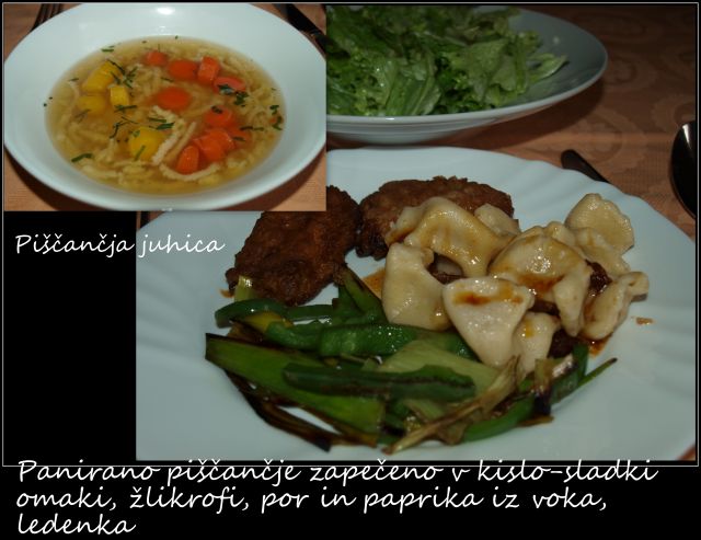 Jaz kokošjo juho z žlinkrofom, kokošje meso in cvetačno solato.