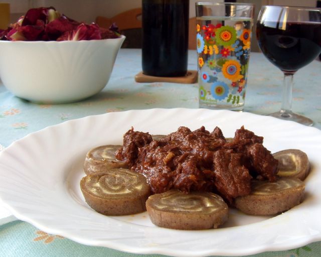 Dušeni puranovi srčk z gobami, skutni cmoki, solata, makov štrudl in domači kapučino (sem pri pospravljanju predalov našla penilec mleka na baterije, namesto esspressa bo pa svoje naredila kafetjera). Nazdravljamo pa že od Ilke naprej.