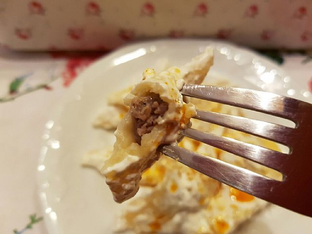, preprosto povedano - kulaci so bosanski žlinkrofi , polnjeni z mletim mesom in politi s kislo smetano in sasekljanim česnom ![]()