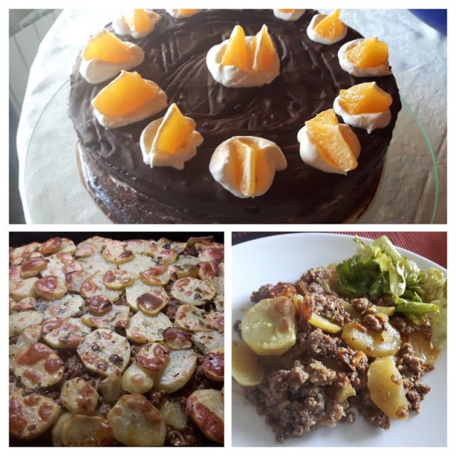 Goveja juha z rezanci, musaka s krompirjem in mletim mesom (na izrecno željo otrok in potencialnega zeta), na koncu čokoladno.pomarančna torta (s kupljenim biskvitom kupila enega pred iztekom roka, haha)