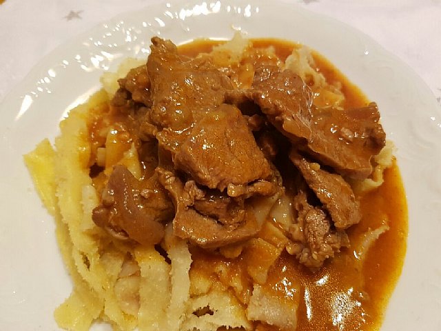 Govedina v čebulni omaki in testenine, pa še zelena solata ...