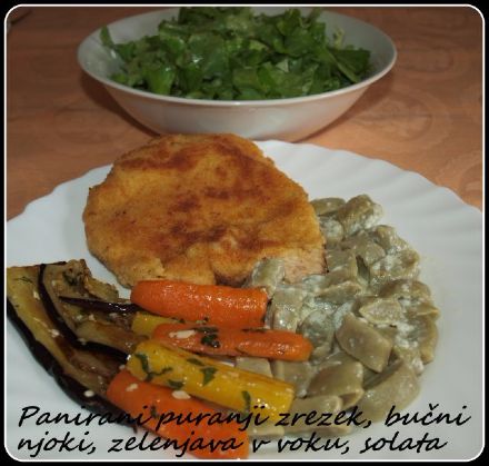 Danes je bil en del kosila po receptu iz knjige Marije Fras, ki je zbrala stare prleške in prekmurske recepte. Smo naredili za en del družine kotlete v omaki iz šunke in čebule. Za prste polizat. Drugi del družine je jedel pečene perutničke in piščančji file na zelenjavi, z olivami in kaprami ter mediteranskimi začimbami, Za prilogo so bili ostanki iz zamrzovalnika: nekaj sirovih štrukljev, nekaj krompirjev svajlkov, za dodatek sem razvaljala ostanek testa za pico, ga razrezala na kvadratke, skuhala in prepriažila na čebuli z dodatkom mlete rdeče paprike (haha, polovica grenadirmarša). Repincl za solato, pa kumare s praženim sezamom in črna redkev s fižolom.