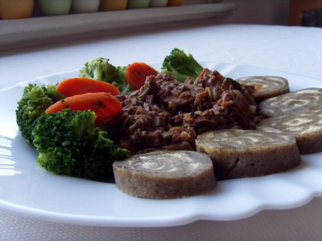 , danes reciklaža mesa iz juhe (čebula, česen, kapre, paradižnikova kaša...), ajdovi štruklji, zelenjava