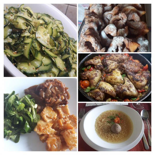 Polnjeni tortelini, sirova omaka z grahom, francoska solata in pohani piščančji fileji poleg še od včeraj, krofi in kava ![]()