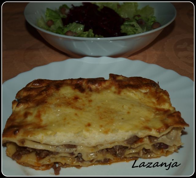 Lazanja z doma narejenim testom, zelena solata in rdeča pesa: