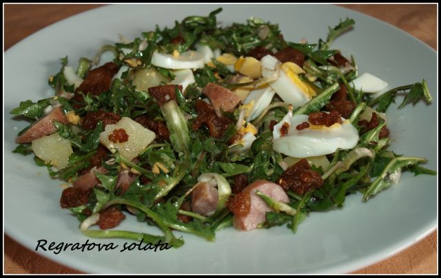 - regrat v solati z vrocimi ocvirki, fajn kislo