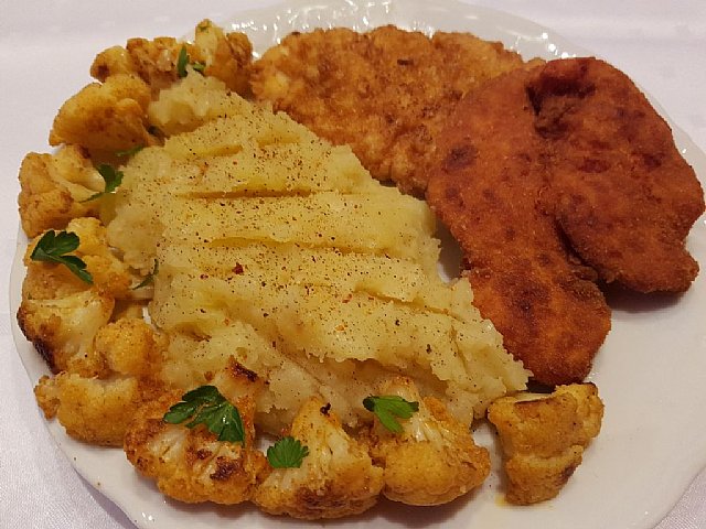 Piščančji file po pariško in dunajsko, pražen krompir in pečena cvetača...