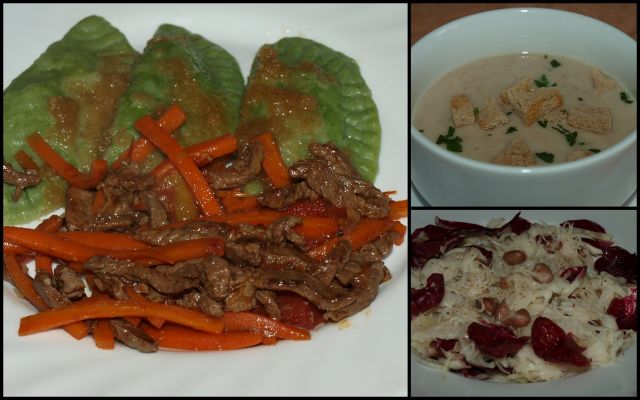 Fižolova juhica; zeleni žepki na maslu in drobtinami, govedina in korenček v voku;