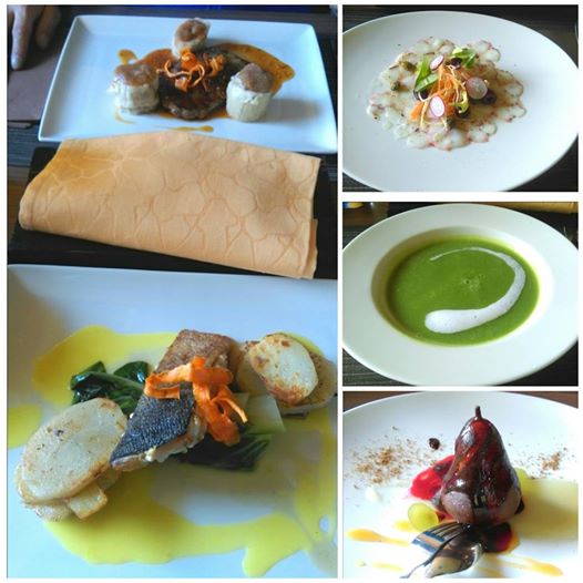 : karpačo iz hobotnice, brokolijeva juha, losos z blitvo in krompirjem oz ramsteak z ajdovimi štruklji in pečena hruška s čokolado in jabolčno čežano ![]()