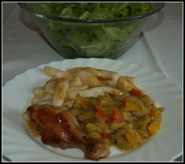 Svaljki, bučke in korenček v omaki, pečeno pišč.bedro, berivka