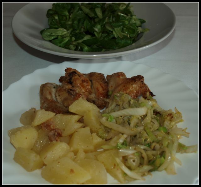 Zabeljen krompir, zelje in koromač v voku, pečene perutničke, motovilec