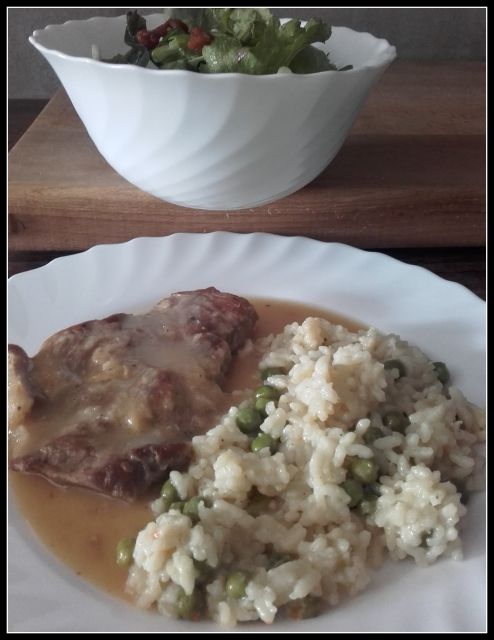 njoki v gobovi omaki, zelena solata, breskov kompot